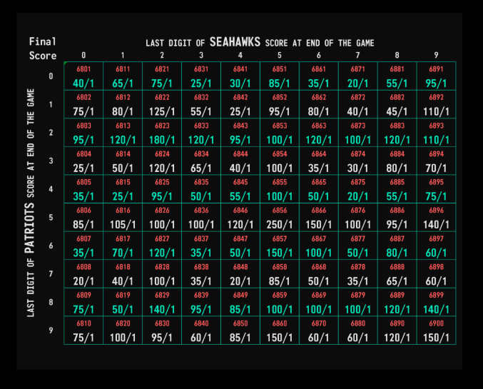 Using the example above of NFC 7, AFC 3 for the first quarter, that opened at +850 for Super Bowl LX in the first quarter. Last year’s Super Bowl was NFC 7, AFC 0 after the first quarter, which opened at +450 for this one between the Patriots and Seahawks. Much like traditional squares, it is based on the last digit of a team’s score.