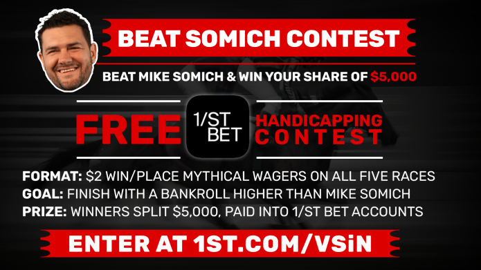 If you think you can beat me, today is the day to prove it! Head over to 1st.com/vsin and sign up for the Beat Somich contest! Simply pick five races, and if you end up with a higher bankroll than me, you split $5,000!