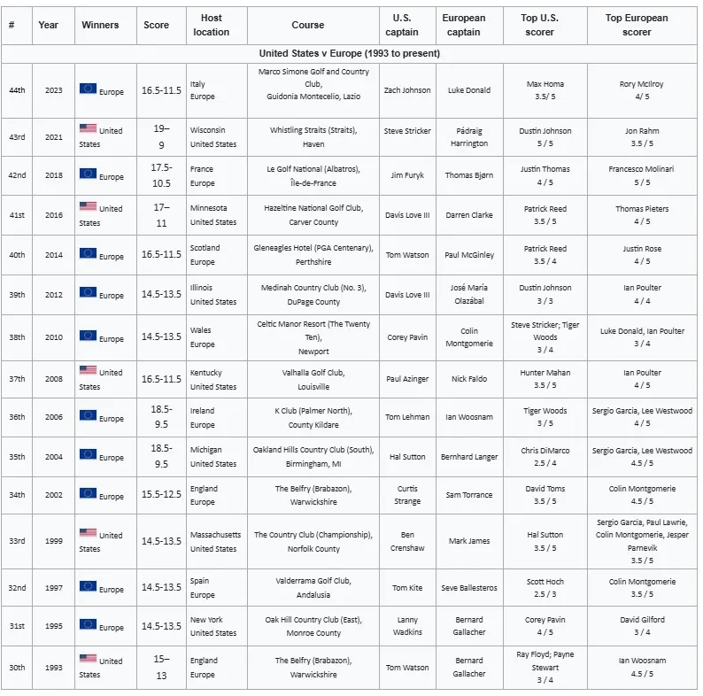 Here are the overall Ryder Cup records since 1979, when the event went to a USA vs. Europe format.
